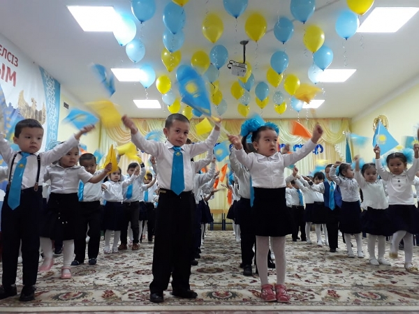 Көрнекілігі: Қазақстан Республикасының мемлекеттік рәміздері: Туы, Елтаңбасы, Әнұраны, Н.Ә. Назарбаевтың портреті, слайд. Жалаушалар, шарлар, гүлдер, музыкамен жабдықталған.