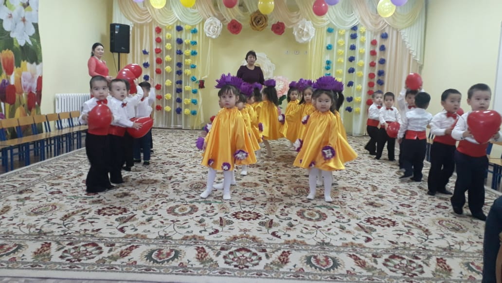Балалар залға  әуенмен алдымен қыздар келеді,одан кейін жүрекше шарларымен ұл балалар келеді.
