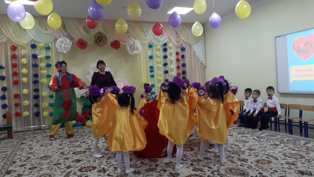 Сайқымазақ: Балалар сендер өнерлі балалар екенсіңдер,енді менімен ойнағыларың келеме?-Ендеше балалар қыздарымызға гүл сыйлау ойынын ойнайық.
